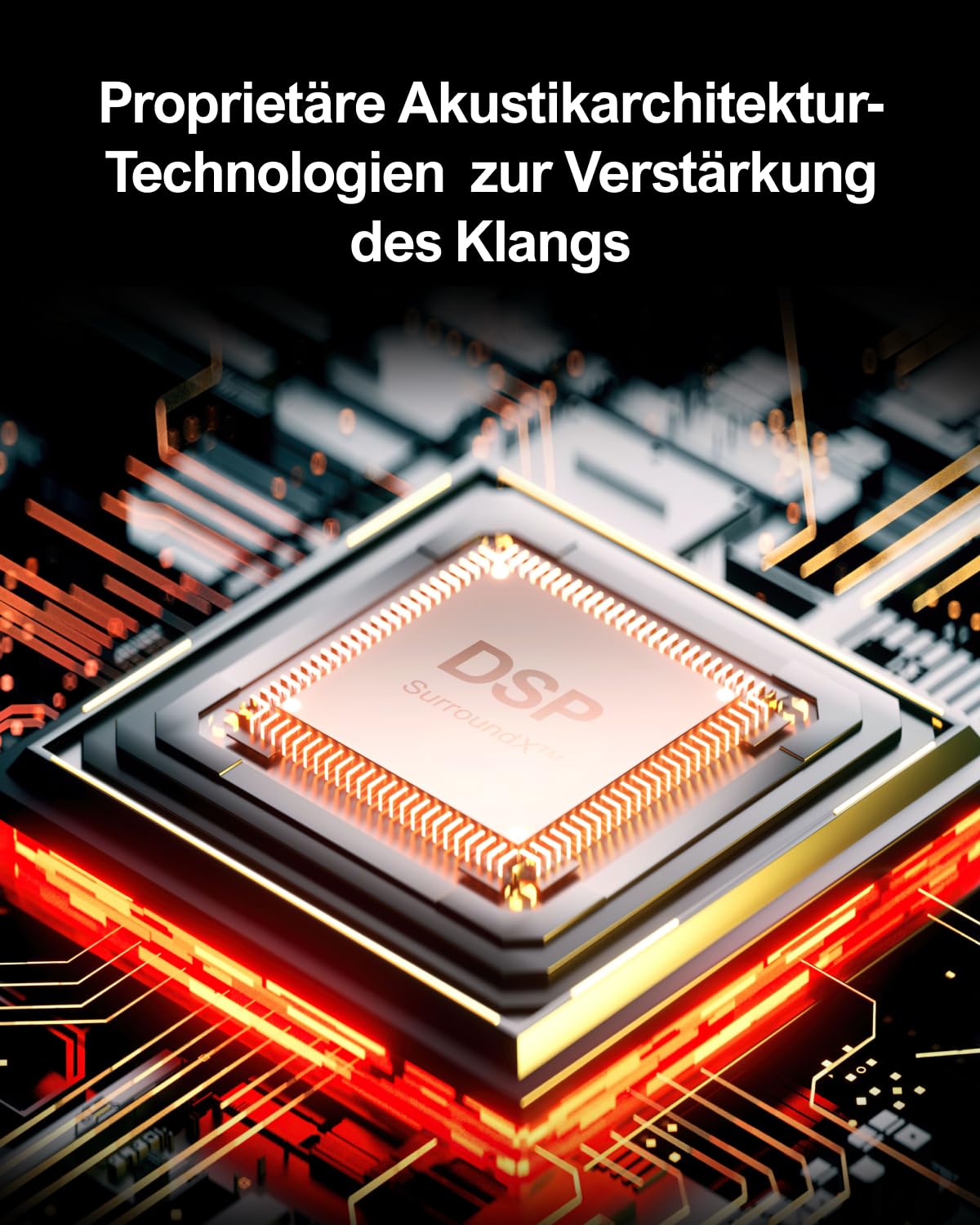 - Immersiver Surround-Sound durch SurroundX-Technologie: Der SurroundX-Algorithmus wandelt 2.0 PCM in ein 5.1-Surround-Signal um. Lassen Sie den Klang um sich herum fließen und erreichen Sie mit Surround Sound die nächste Stufe für dynamischere Unterhaltung.
